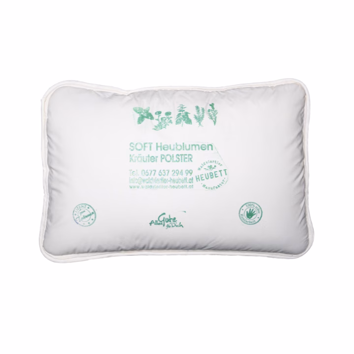 Stellen Sie sich vor, Sie legen Ihren Kopf auf ein weiches Kissen, das sanft nach frischem Sommerduft duftet. Unser neuer Soft-Polster mit Bio Heublumen und Kräutern verbindet natürlichen Duft mit außergewöhnlich weichem Liegekomfort – für ein besonders behagliches Schlafgefühl.